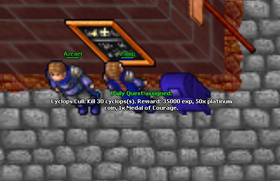 Added daily quests, random quest can be obtained from blackboard near Thais cross roads. Complete the quest for Exp and medals of courage. Medals of courage can be traded in for custom backpacks