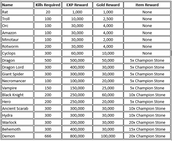 NPC Greg Davies in Thais Library (Next to DP) will reward you for doing tasks. You can choose either an EXP or Gold reward. For some tasks you can choose Champion Stones as a reward.